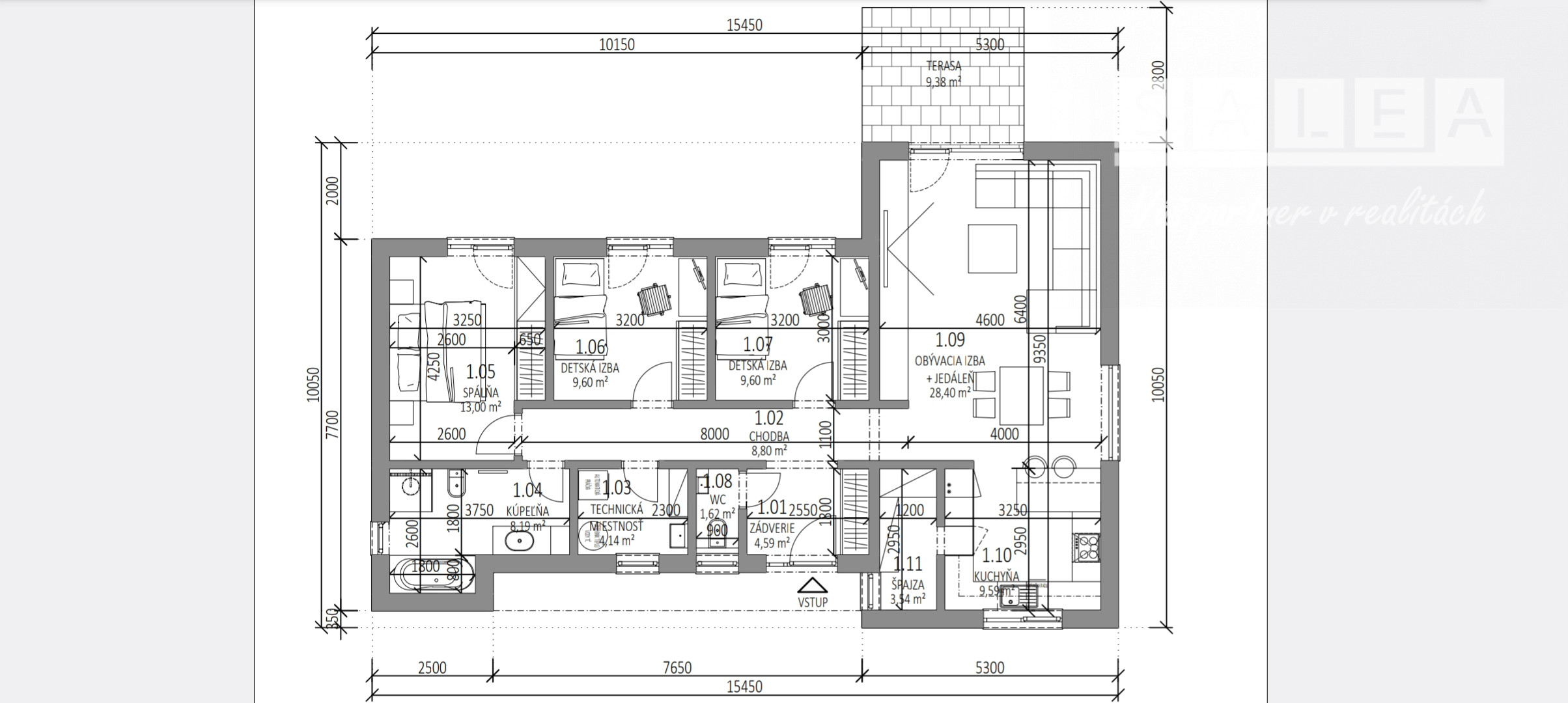 Dispozícia RD: vstupná chodba , po pravej strane sa nachádza veľká obývačka s výstupom na terasu otvorená s kuchyňou, špajza, detská izba, po ľavej strane sa nachádza samostatné wc s umývadlom, technická miestnosť ( bojler na ohrev teplej vody, príprava na práčku), kúpeľňa (s druhým wc, vaňou, umývadlom a sprchou), spálňa a detká izba. Rodinný dom je postavený z kvalitných materiálov. Kúrenie v dome je podlahové elektrické ( termostat v každej izbe), predpríprava na klimatizáciu na chodbe, zateplenie v obvodových stenách 15 cm minerálna vata, zateplenie domu z vonku 10 cm polystyrén, zateplenie stropu 30 cm minerálna vata a fatrafol. Dom je napojený na: elektrinu, vodu, kanalizáciu, optiku ( plyn nie). Z vonku domu je osvetlenie, kvalitné vstupné dvere, plastové okná 3 sklo.