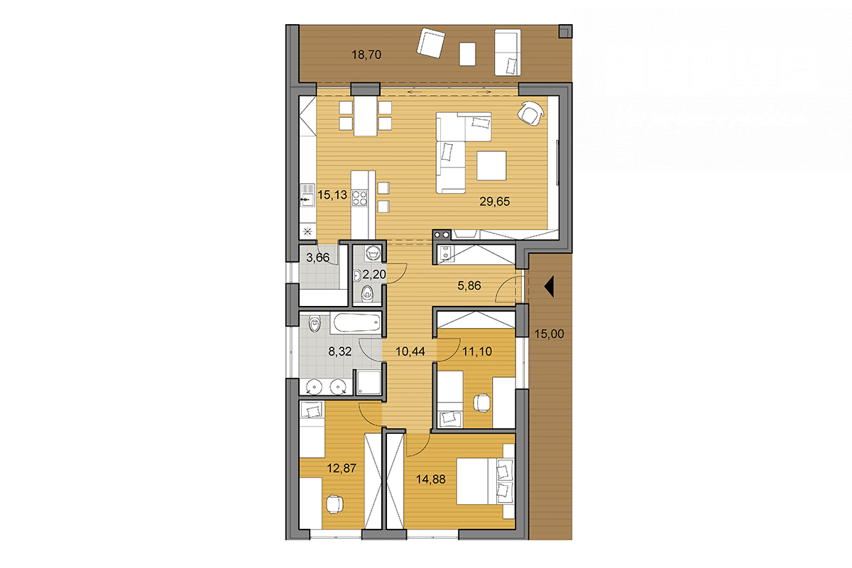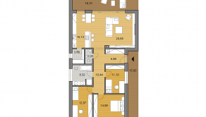 V dome sú použité štandardné materiály – obvodové a nosné múry brúsená Pezinská tehla 30 300mm, strešná krytina MEDITERAN alebo BRAMAC– čierna, strešná izolácia minerálna vata 300 mm + izolácia 80mm • zateplenie fasády – polystyrén 150 mm. V dome sú plastové okná a vchodové dvere – 3 sklo z vonku laminované vo farbe antracit SALAMANDER. Podlahy , kompletné rozvody elektriny, vypínače a zásuvky biele, dátové rozvody podľa projektu, príprava na možnosť pripojenia ďalších dátových sietí. V dome je kompletné podlahové kúrenie, kompletné rozvody vody. Dom je napojený na inžinierske siete – voda, elektrina, kanalizácia. Dom sa ponúka v prevedení čiastočného štandardu. Foto interiéru ilustračné.