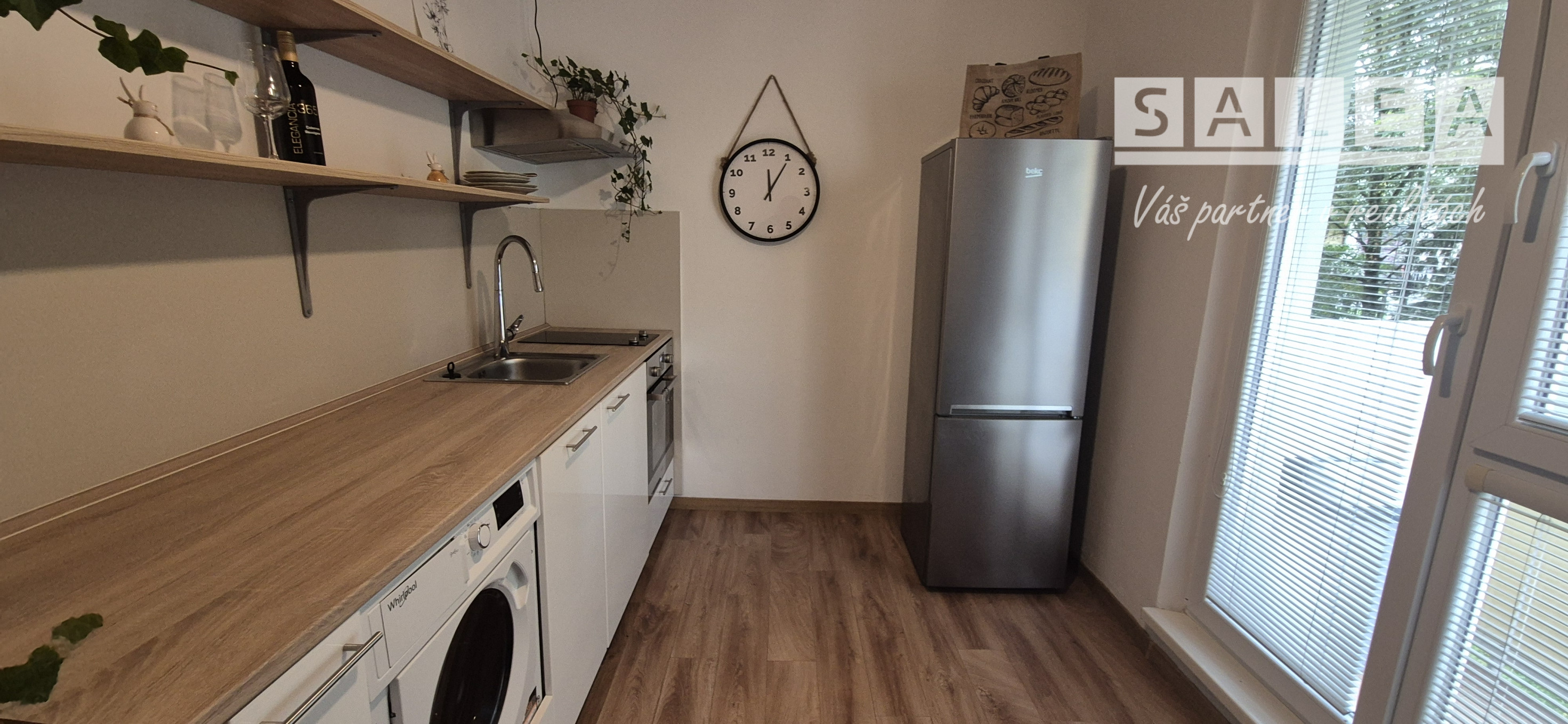 Vybavený spotrebičmi, kuchynská linka ( elektricjá varná doska, chladnička s mrazničkou, umývačka riadu , práčka kombinovaná so sušičkou) samostatná kúpeľňa, samostatné WC, byt ma balkón v kuchyni + francuzske okna v spálni