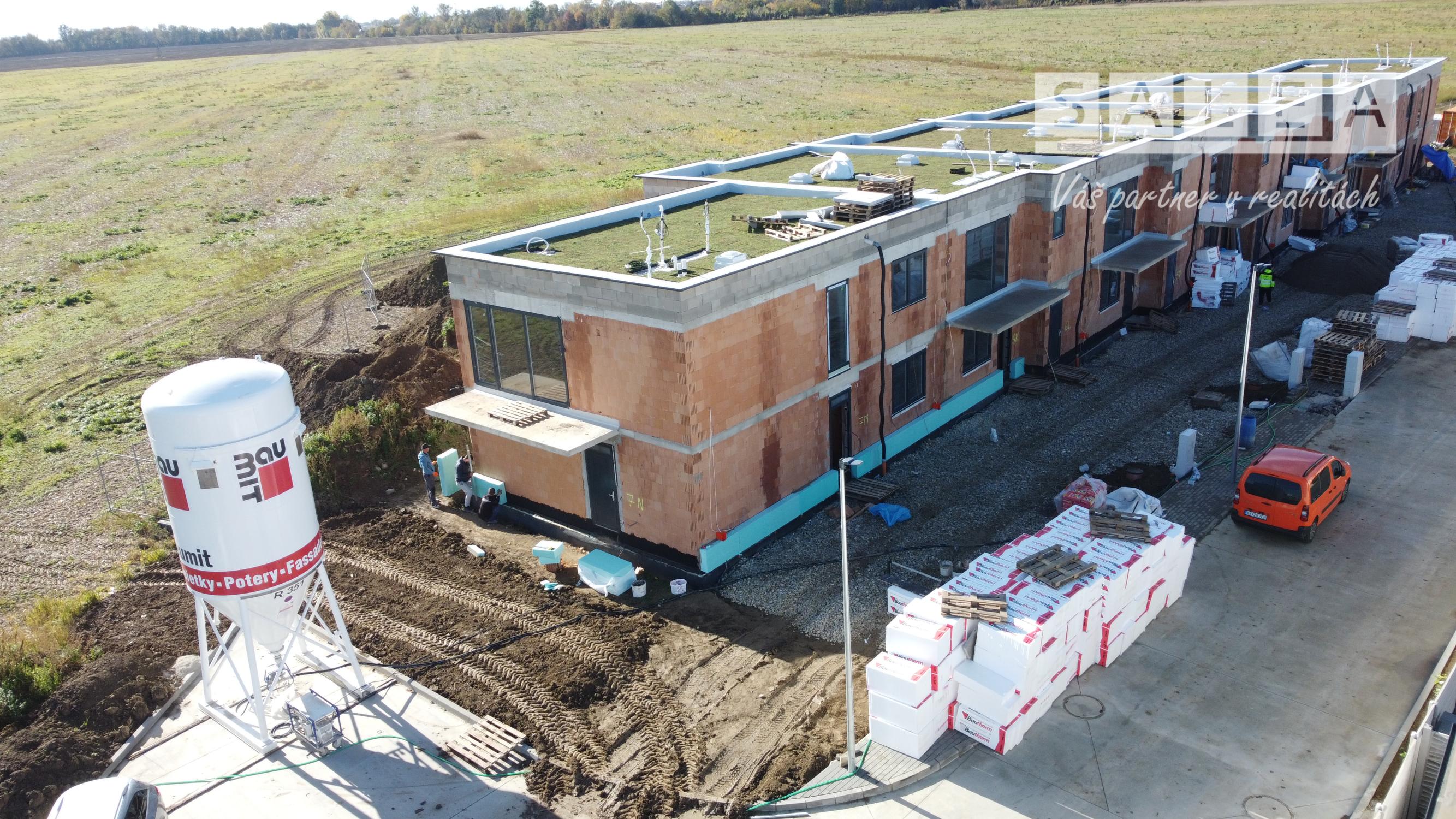 brúsená tehla, minerálna izolácia, fasádna izolácia hrúbky 20cm (EPS + Minerálna vlna), sadrové omietky, plastové veľkoformátové okná (izolačné trojsklo - Rehau), hliníkové vchodové dvere, podlahové kúrenie (tepelné čerpadlo v každom byte, termostat), strešná izolácia hrúbky 45cm, železobetónové stropy.