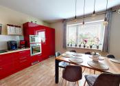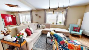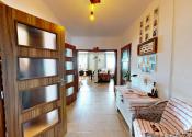 Dispozičné riešenie: vstupná chodba + odkladací priestor, presvetlená priestranná obývačka + (predpríprava murovaný krb), bezbariérovo prepojená s kuchyňou + 2x okno, kuchynská linka + vstavané spotrebiče (sklokeramická varná doska), s bezbariérovým prístupom do 1x spálňa. Kúpeľňa spojená s toaletou (sprchový kút + sanita+ okno), schody na poschodie + vstup do pivničných priestorov.
