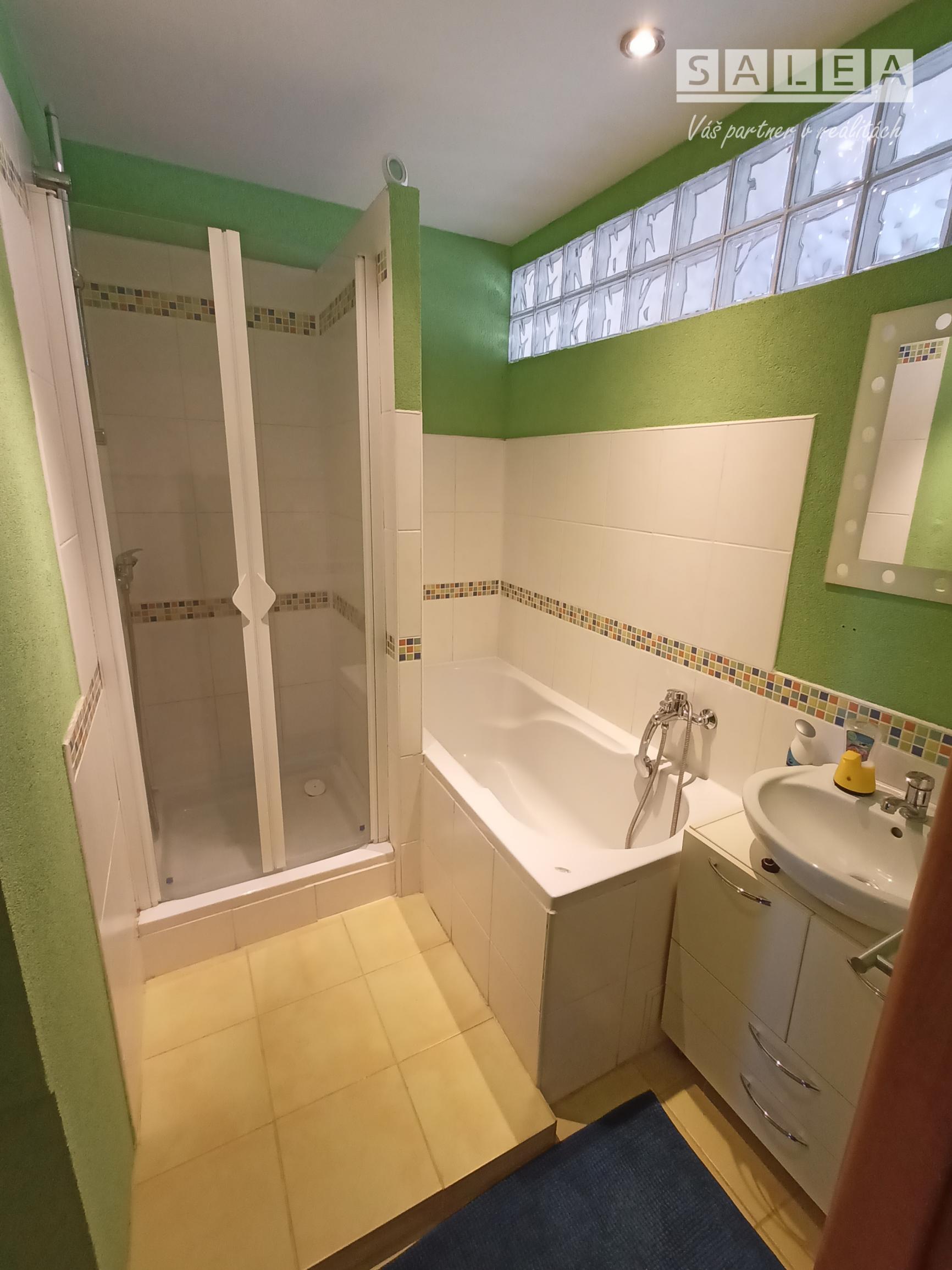Kúpeľňa je riešená nadštandardne – nájdete v nej vaňu aj sprchový kút a dostatok priestoru na plnohodnotnú práčku aj sušičku, čo výrazne zvyšuje komfort bývania.