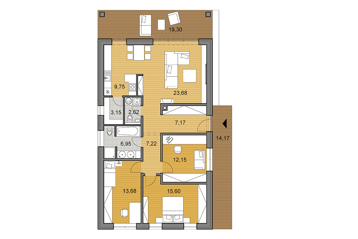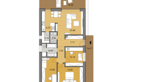 Salea váš partner v realitách ponúka na predaj moderný 4 izbový bungalov typ- i102 ktorý sa stavia na pozemku o rozlohe 495m2 v Senci na Kapria ulici. Plocha: úžitková 101,65m2, zastavaná 146,91m2. Projekt domu spĺňa prísne nízkoenergetické štandardy súčasnej doby a je navrhnutý tak, aby spĺňal požiadavky aj náročnejších klientov. Pôdorys je rozdelený na dennú a nočnú časť takým spôsobom aby sa tieto navzájom nerušili. V každej miestnosti je priestor pre veľkú vstavanú skriňu. Obývacia izba je spojená s kuchyňou a jedálňou s vchodom na čiastočne krytú terasu orientovanou do záhrady. V dome sú použité štandardné materiály – obvodové a nosné múry brúsená Pezinská tehla 30 300mm, strešná krytina MEDITERAN alebo BRAMAC– čierna, strešná izolácia minerálna vata 300 mm + izolácia 80mm • zateplenie fasády – polystyrén 150 mm. V dome sú plastové okná a vchodové dvere – 3 sklo z vonku laminované vo farbe antracit SALAMANDER. Podlahy – plávajúce podlahy, kompletné rozvody elektriny, rozvody vody, vypínače a zásuvky biele, dátové rozvody podľa projektu, príprava na možnosť pripojenia ďalších dátových sietí. Dom je napojený na inžinierske siete – voda, elektrina, tepelné čerpadlo, kanalizácia.