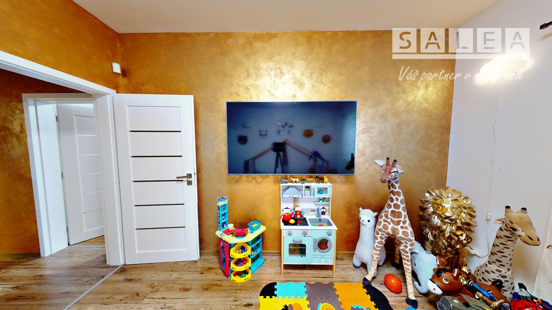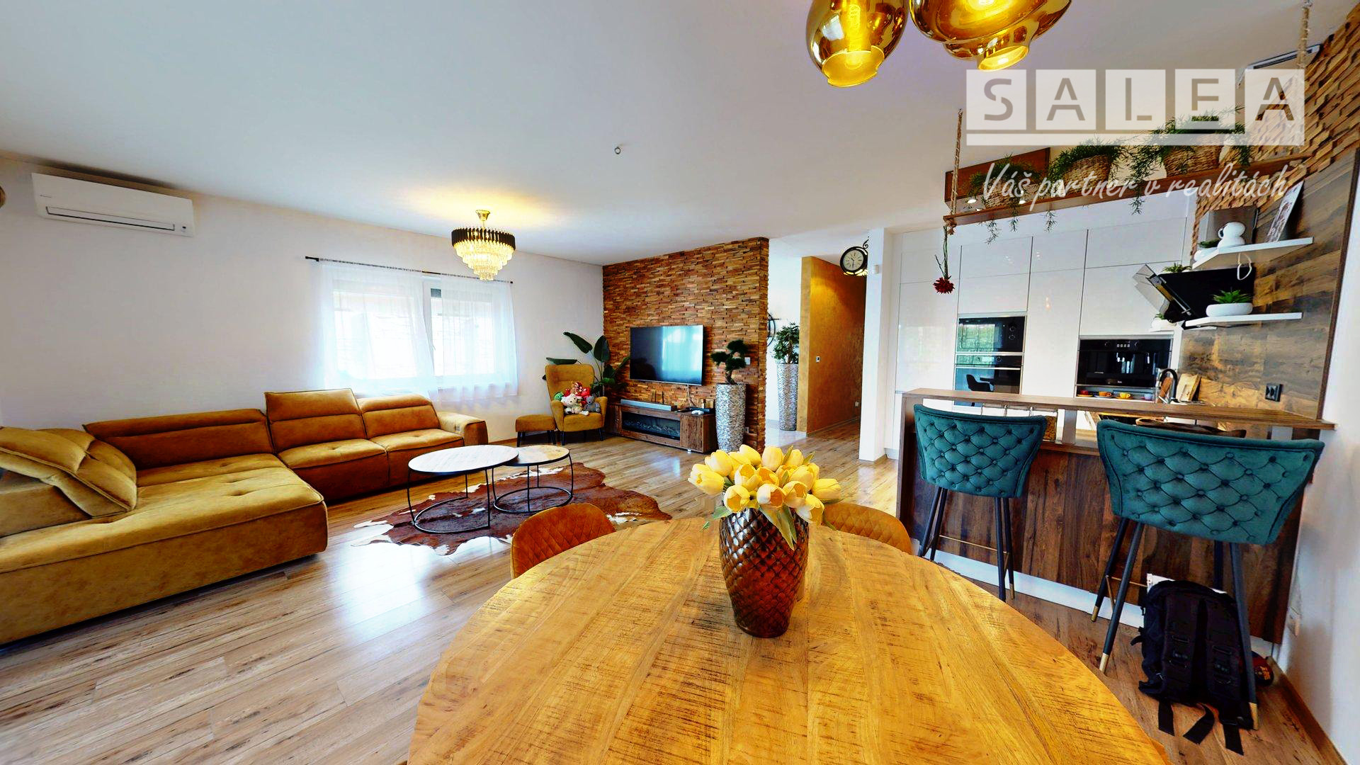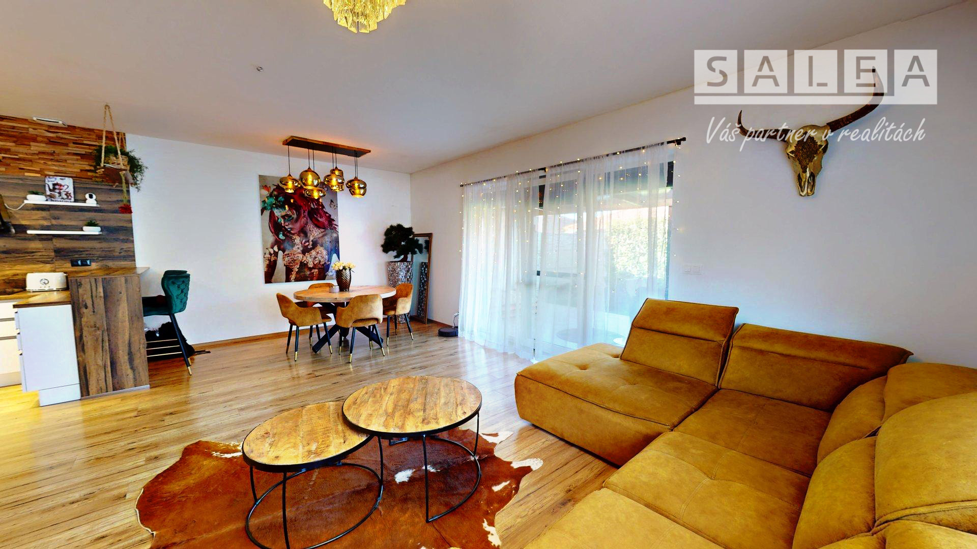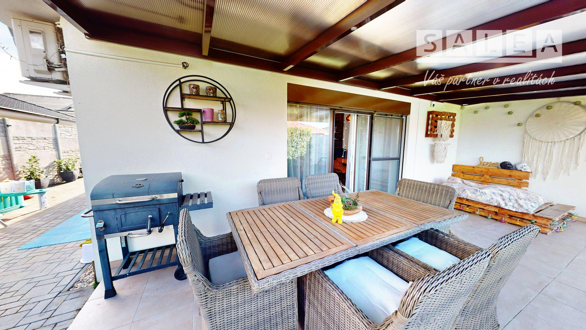 SaleA- Váš partner v realitách Vám výhradne iba u Nás ponúka na predaj krásny a moderný rodinný dom ( ktorý je súčasťou dvojdomu), o výmere 113,4 m2 v Galante na Mládežníckej štvrti. Dom sa nachádza na pozemku o výmere 352 m2. Dispozícia domu: vstupná chodba, otvorená kuchyňa s obývačkou a jedálenskou časťou s výstupom na terasu, technická miestnosť kde sa nachádza bojler, práčka a úložný priestor ( vstup na povalu, ktorá je pochôdzna a spevnená podlaha tak, že si tam viete sraviť ďalšiu izbu), samostatné wc s umývadlom, kúpeľňa so sprchovým kútom, vaňou a dvomi umývadlami, spálňa s rolldor šatníkom, izba s rolldor šatníkom a detská izba s rolldor šatníkom. V celom dome sú vonkajšie elektrické hlinníkove žalúzie, alarm, kamery, 2 x klimatizácia( jedna v obývačke, druhá na chodbe pri izbách). Hlinníkové zastrešenie terasy plus osvetlenie, záhradný domček na náradie, 3 parkovacie mieste na auto, elektrická vstupná brána aj malá bránka, studňa. Vybavenie kuchyne: indukčná varná doska, digestor, vstavaná mikrovlnka a rúra, vstavaná chladnička s mrazničkou, vstavaný kávovar, barový pult s barovými stoličkami. IS: voda, elektrina, kanalizácia, optika. Kúrenie v dome je podlahové elektrické ( elektrické odporové káble), na ohrev teplej vody je elektrický bojler. Termostatny na nastavenie teploty v každej izbe zvlášť. Doplňujúce info: rodinný dom je súčasť dvojdomu, akvšak medzi domami má každá časť domu svoj obvodový múr, nieje to jedna spoločná stena). Mesačné náklady sú 145 € elektrina, 15 € voda. K tejto nehnuteľnosti máme 3D virtuálnu prehliadku, video a dronové zábery, pre Vašu lepšiu predstavu o nehnuteľnosti. Mesto Galanta má veľmi dobrú občiansku vybavenosť, dobré napojenie na diaľnicu smer: TT, TN, BA, NR... Takisto aj dobrá dostupnosť železničnou dopravou. V prípade záujmu ma neváhajte kontaktovať na 0902 208 854 alebo na pulcova@salea.sk