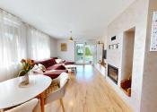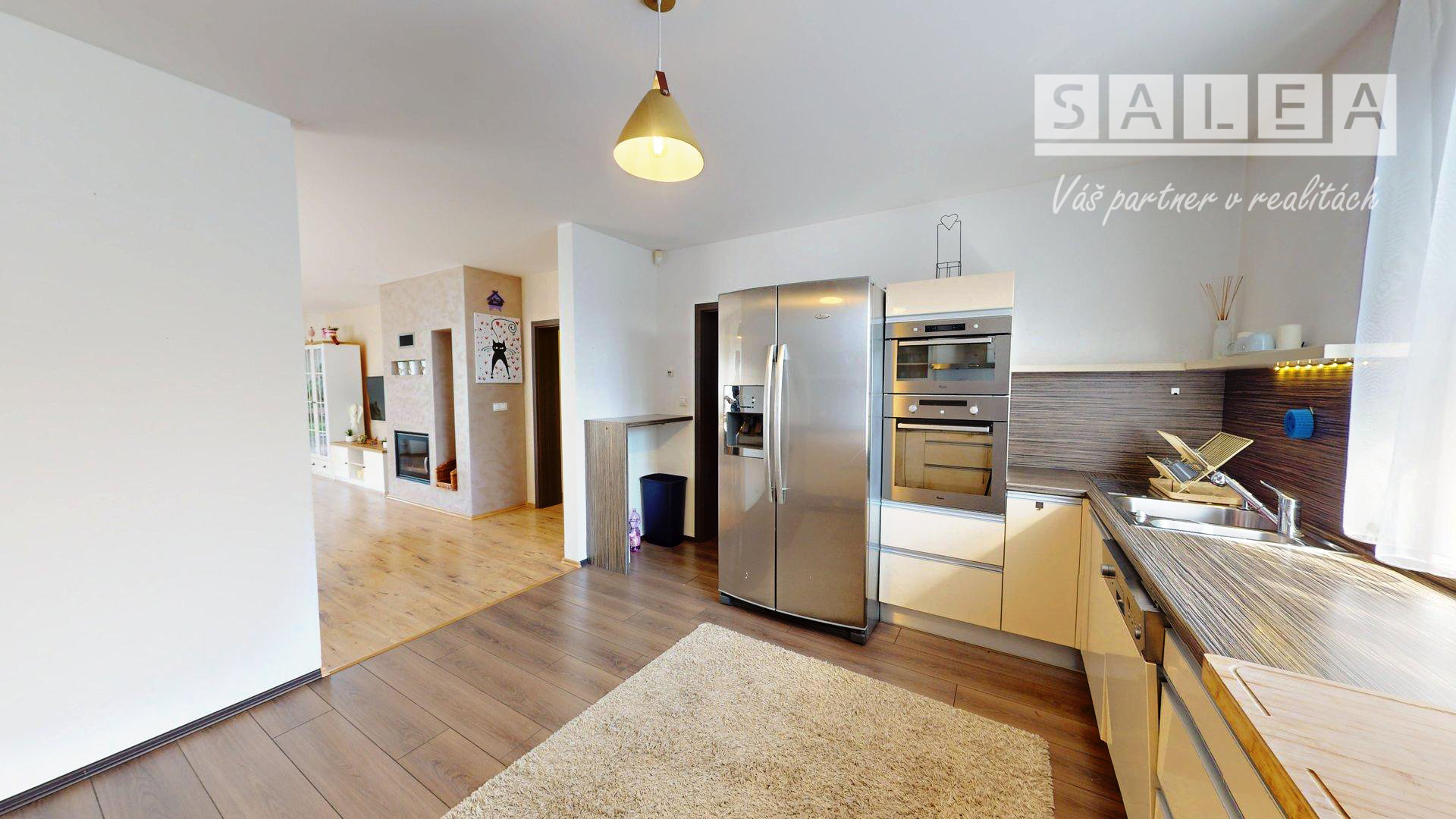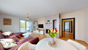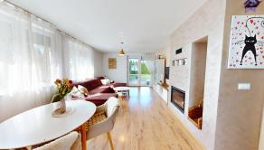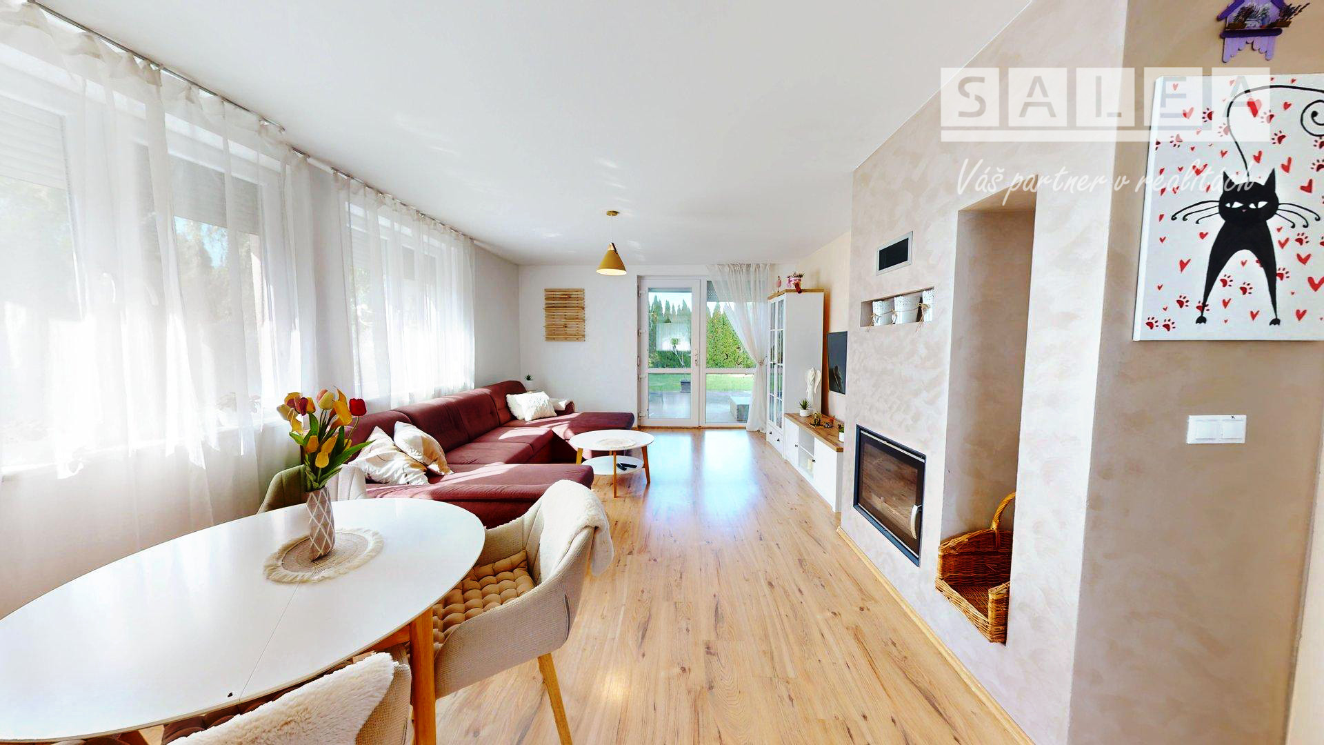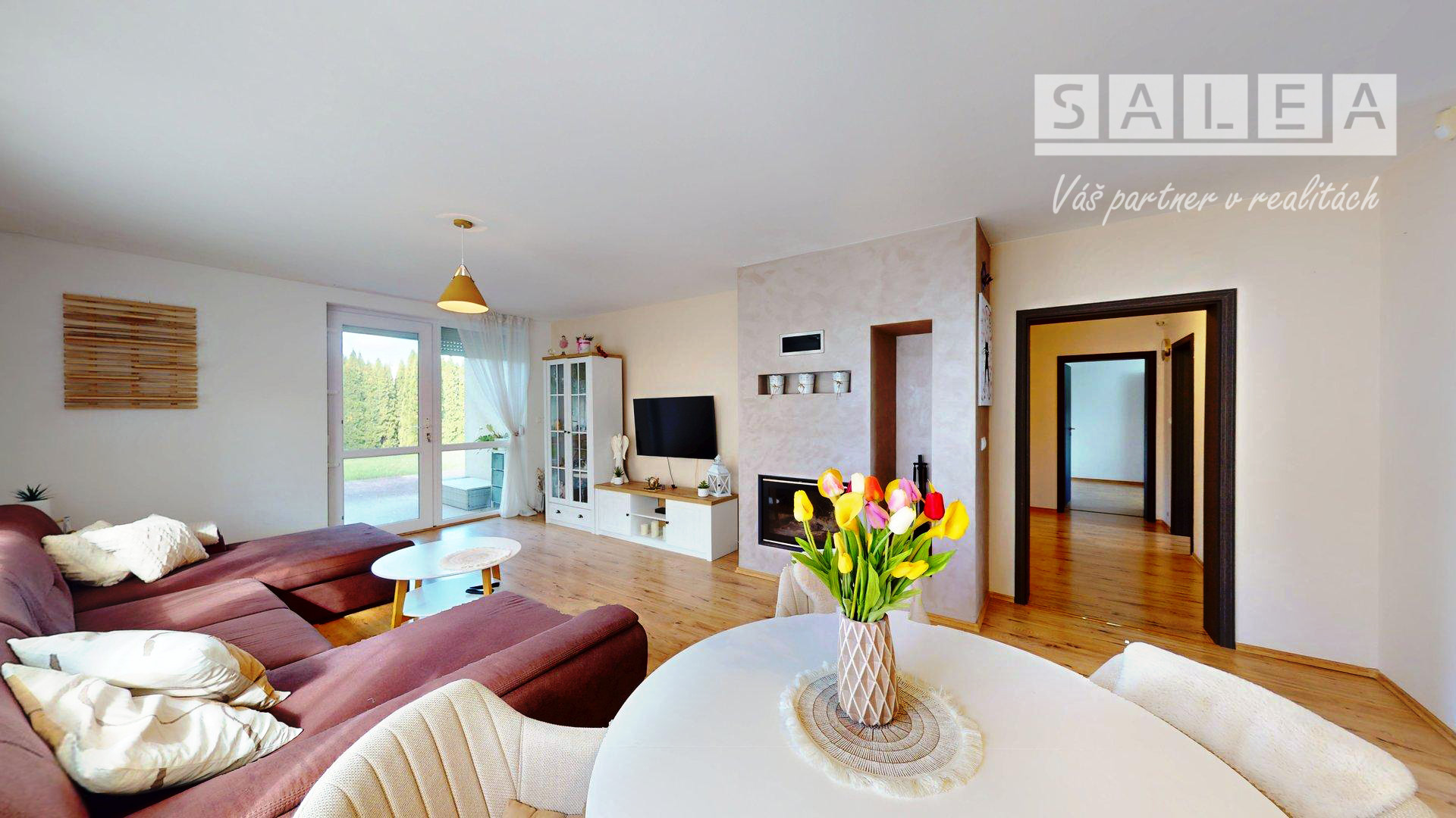 priestranná obývacia izba s krbom - východ na prestrešenú terasu.