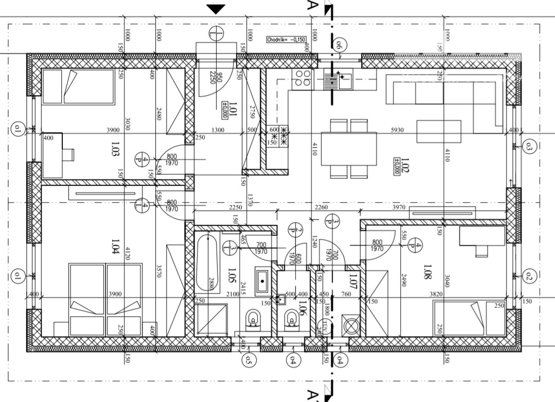 Dispozične je dom navrhnutý ako 4-izbový bungalov, pričom existuje aj možnosť úpravy na priestranný 3-izbový variant podľa preferencií budúceho majiteľa.