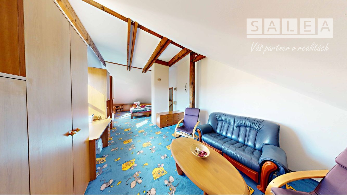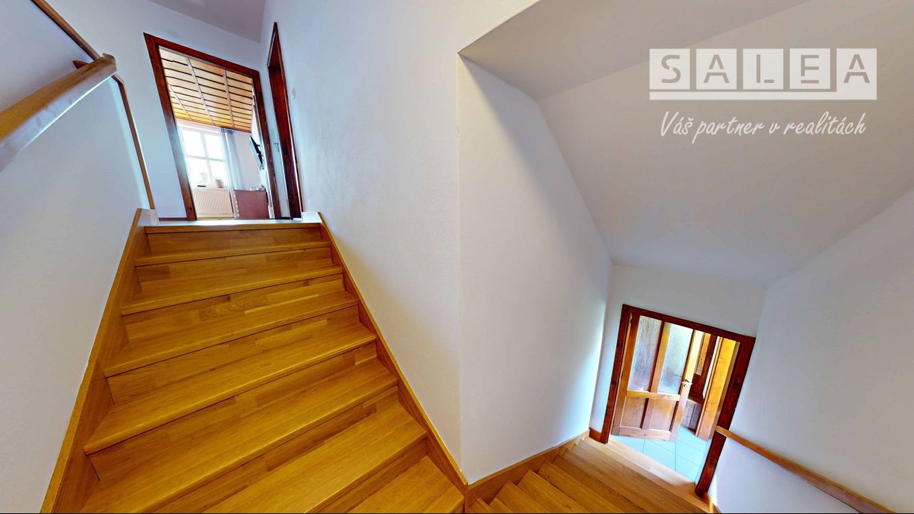Zo vstupného schodiska je vpravo jedna veľká detská izba, priamo oproti schodisku je druhá izba a vľavo od schodiska je situovaná kuchyňa a vpravo od kuchyne je tretia izba, na tomto poschodí ja aj samostatná kúpeľňa s vaňou.